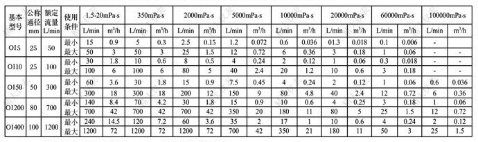 | 基本型號 | 公稱(chēng)通徑(mm) | 額定流量(L/h) | 使用條件 | 粘度(mPa.s) | |||||||