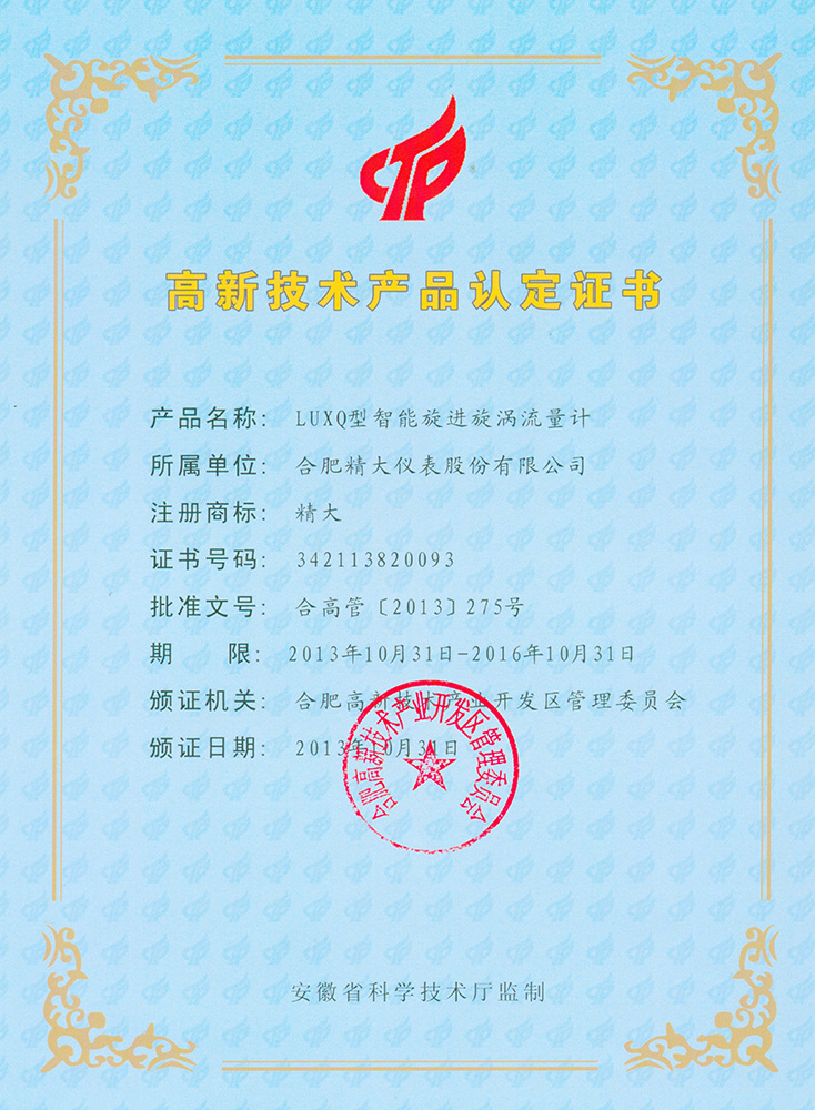 省高新技術(shù)產(chǎn)品認定證書(shū)(LUXQ型旋進(jìn)漩渦)